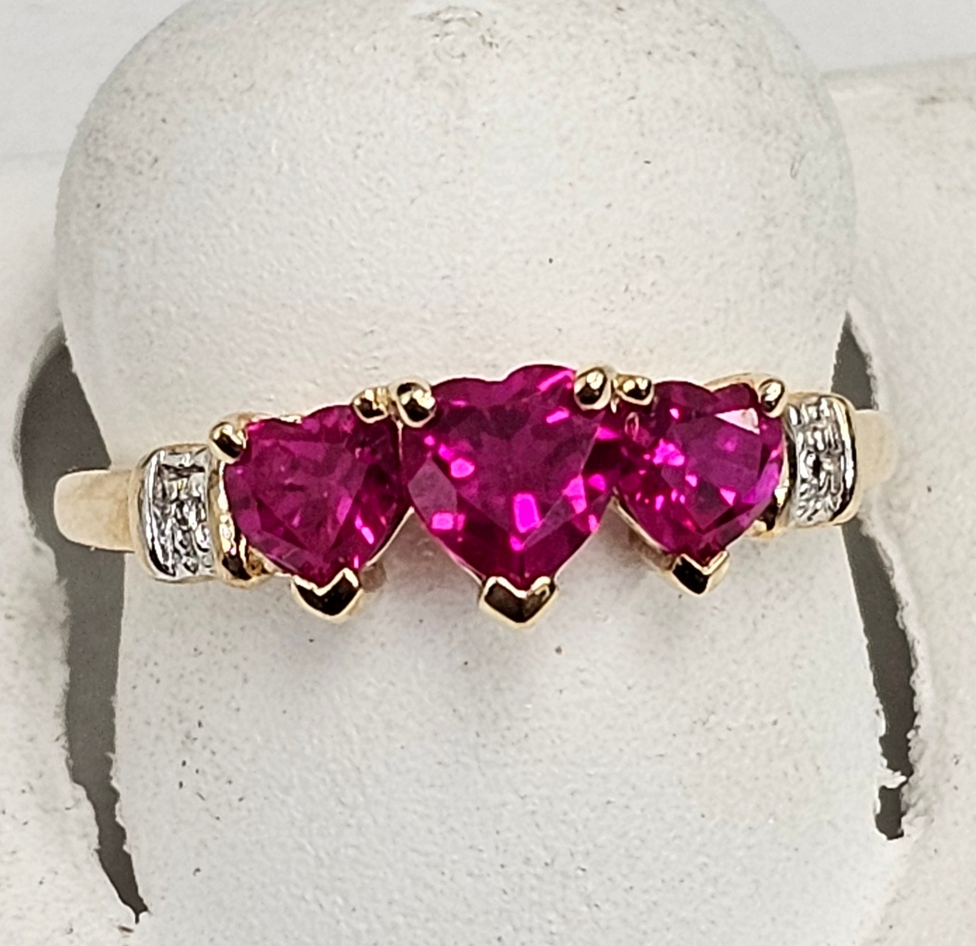 Crafted from radiant 10kt gold, this stunning ring showcases three heart-shaped red gemstones at its center, symbolizing love and passion. Sparkling diamond melee stones elegantly flank the hearts, adding brilliance and sophistication. Designed in a comfortable size 7, this piece is perfect for adding a touch of romance and refined beauty to any outfit.