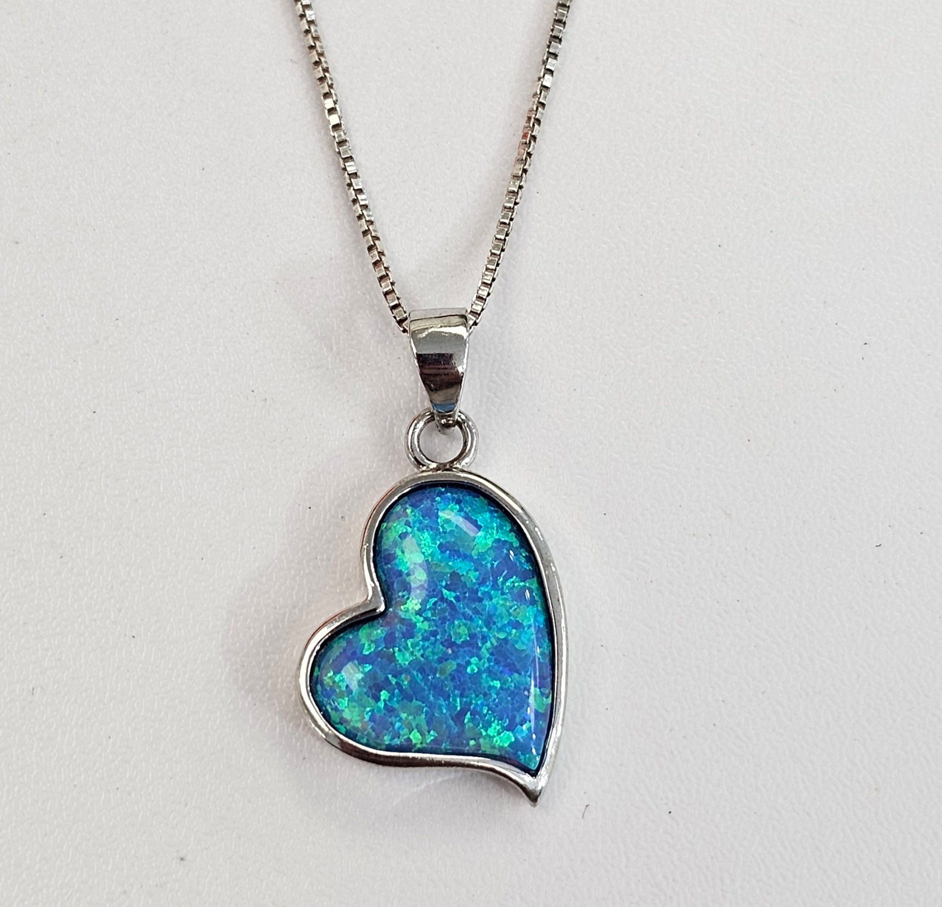 This Silver & Opal Heart Necklace combines timeless elegance with modern craftsmanship. Made from genuine 925 silver, it features a unique heart pendant adorned with lab-grown blue opal, offering vibrant, lasting color without compromise. Paired with a 24-inch box chain, this necklace adds a graceful touch to any outfit, making it an exceptional gift or a stunning addition to your jewelry collection. Elevate your style with a piece designed to captivate.